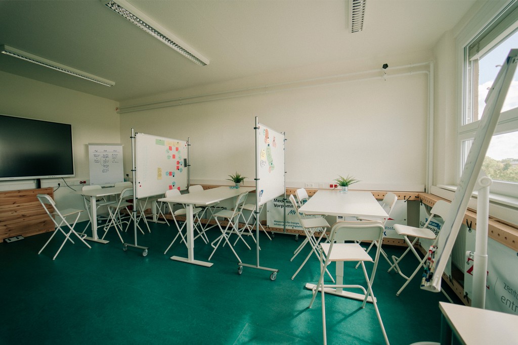 In der Design-Thinking Area gelingt das plastische Hineindenken in Lösungsfindungen quasi von selbst. In diesem Raum findest Du 4 Whiteboards, 2 Flipcharts, mehrere Moderationskoffer, höhenverstellbare Tische, Barhocker und vieles mehr.